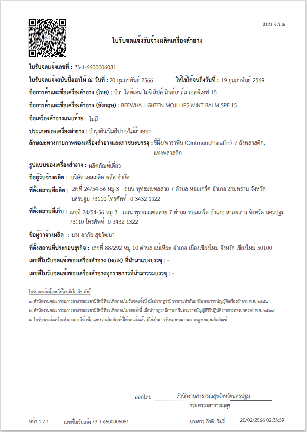 ได้ใบรับจดแจ้งจากเลขาธิการคณะกรรมการอาหารและยาเลขที่ 73-1-6600006081